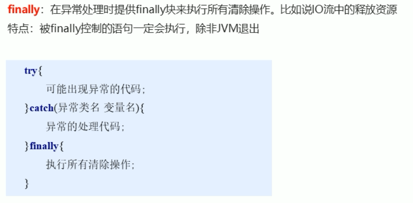 IO中最重要的步骤就是释放资源,上述代码中,假如在执行释放资源前遇到了异常,就会直接进入catch中,而无法执行到close方法,所以必须要有方法来强制执行close方法。finally
