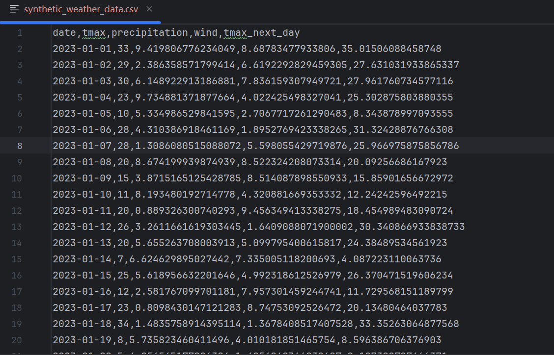 进入网址Seattle Weather Dataset,下载csv文件到Pycharm项目目录下(命名为synthetic_weather_data.csv)