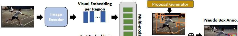 开集检测,在大规模caption数据集上预训练的网络有很强的开放分类能力,所以需要使用caption数据,但是caption数据没有box,所有怎么自动化生成caption的box信息