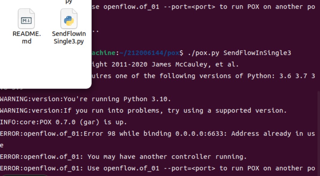 1.重新搭建(一)的拓扑,此时交换机内无流表规则,拓扑内主机互不相通;编写Python程序自定义一个POX模块SendFlowInSingle3,并且将拓扑连接至SendFlowInSingle3(默认端口6633),实现向s1发送流表规则使得所有主机两两互通。
