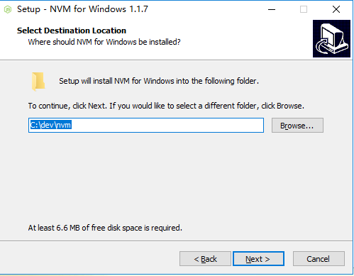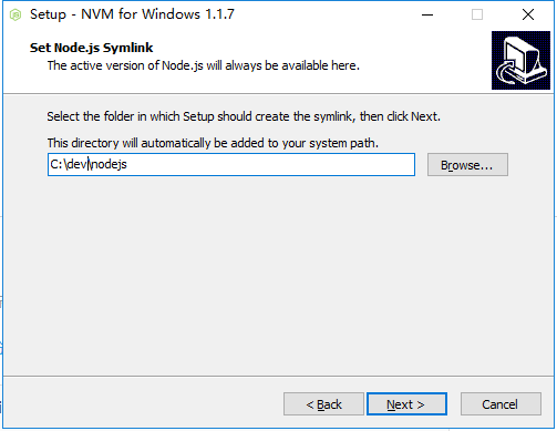 注意:nodejs的地址不要选C:\Program Files\nodejs(使用这个地址,nvm表面上安装成功,实际是安装失败的,执行node -v提示不是内部命令)