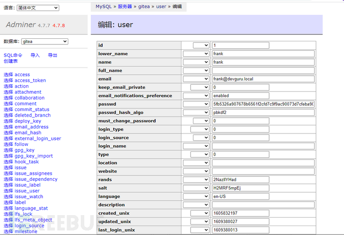 起初只复制了passwd,结果登陆不上,搜索后发现密码生成和salt、hash_algo有关,就直接复制本地表内容覆盖原内容了。保存后成功利用修改后的密码登录gitea