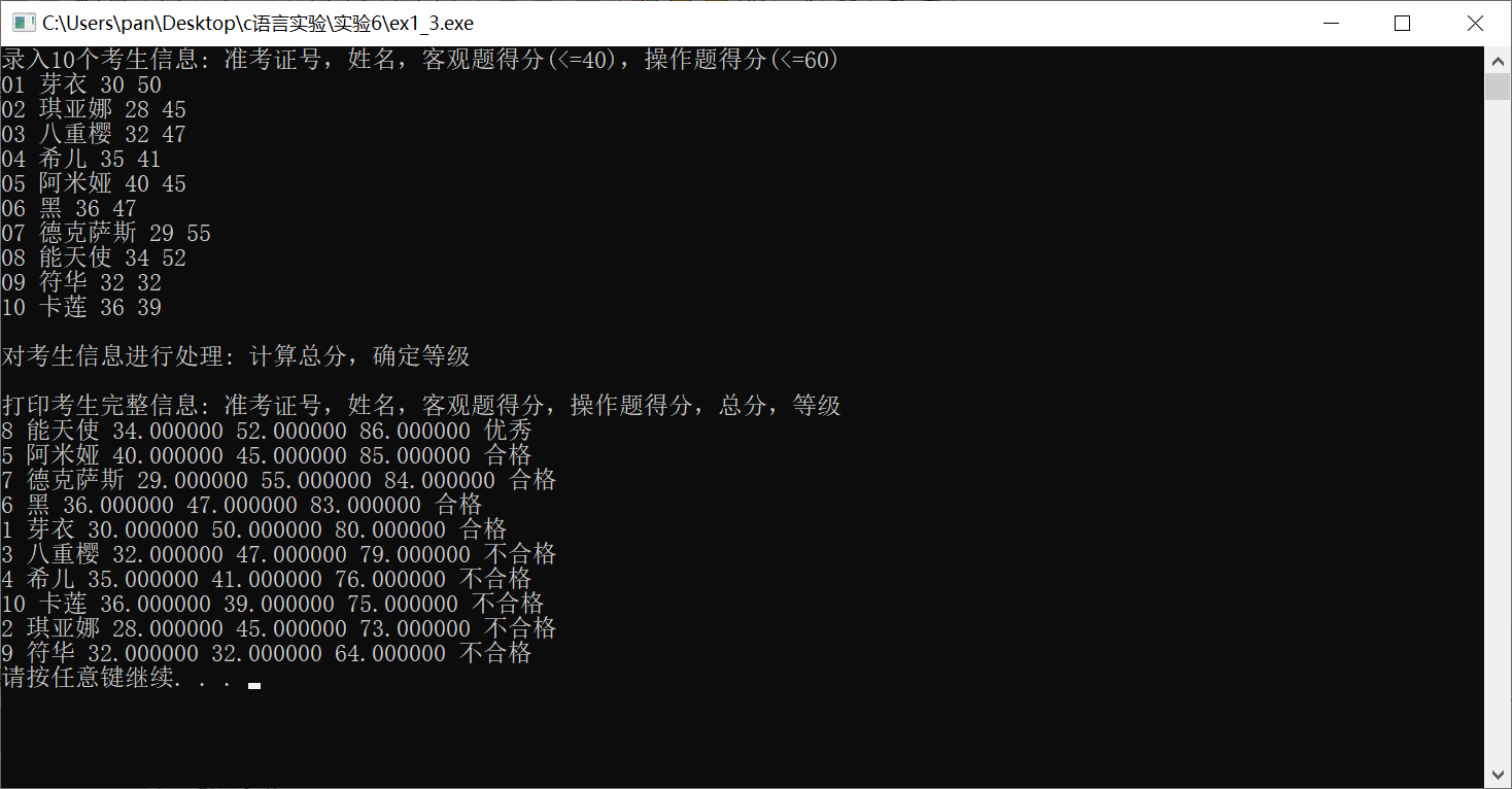 printf("\n打印考生完整信息: 准考证号,姓名,客观题得分,操作题得分,总分,等级\n");