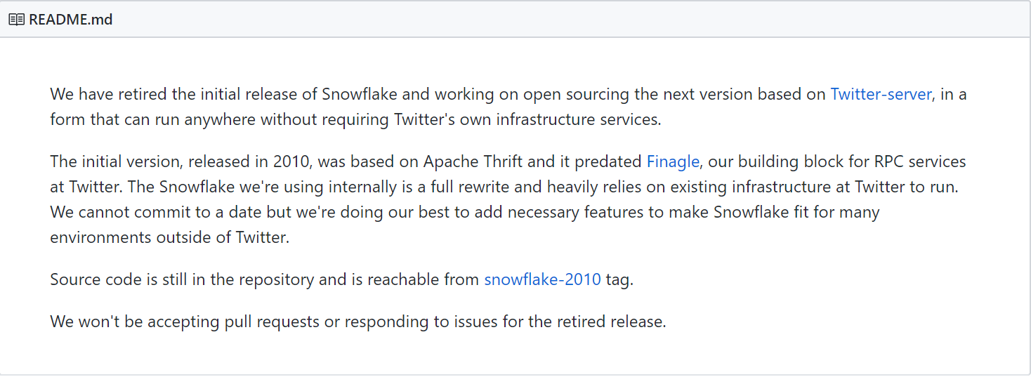 这个文档其实就是告诉我们:这个项目还在完善,完善的方向就是让SnowFlake适配其他环境,具体什么时间能弄完不知道。