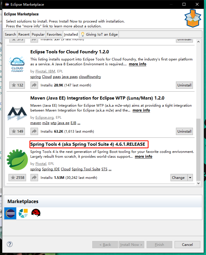 - 打开eclipse,选择help-->Eclipse marketplace,在Search中搜索spring tool suite,点击install,图标如下图所示,本人已安装。