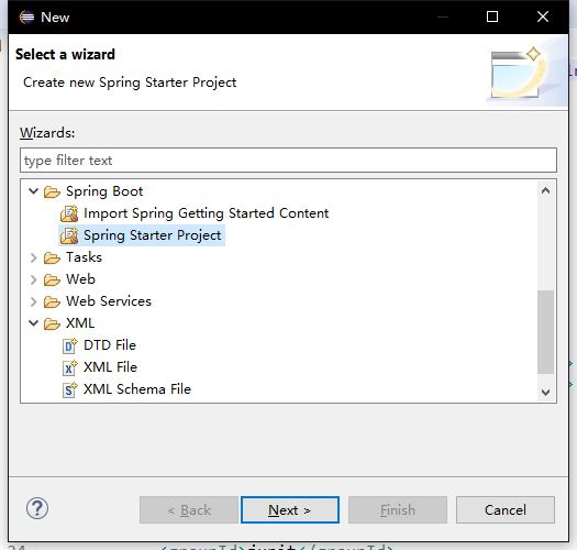 2.新建项目,file-->new-->other,选择Spring Boot下的Spring Starter Project,点击next。