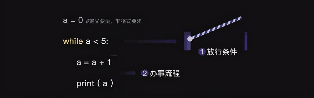while a < 5: #设定一个放行条件:a要小于5,才能办事