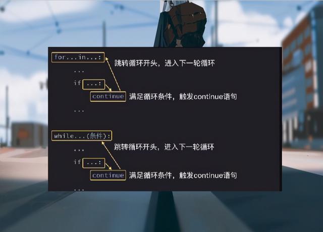 continue的意思是“继续”。这个子句也是在循环内部使用的。当某个条件被满足的时候,触发continue语句,将跳过之后的代码,直接回到循环的开始。
