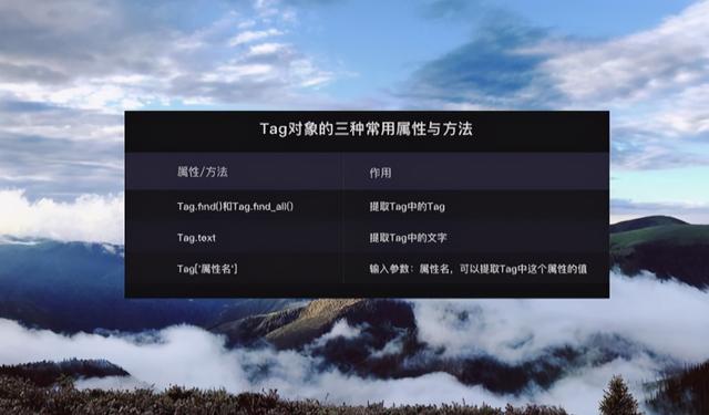 括号中的参数:标签和属性可以任选其一,也可以两个一起使用,这取决于我们要在网页中提取的内容。