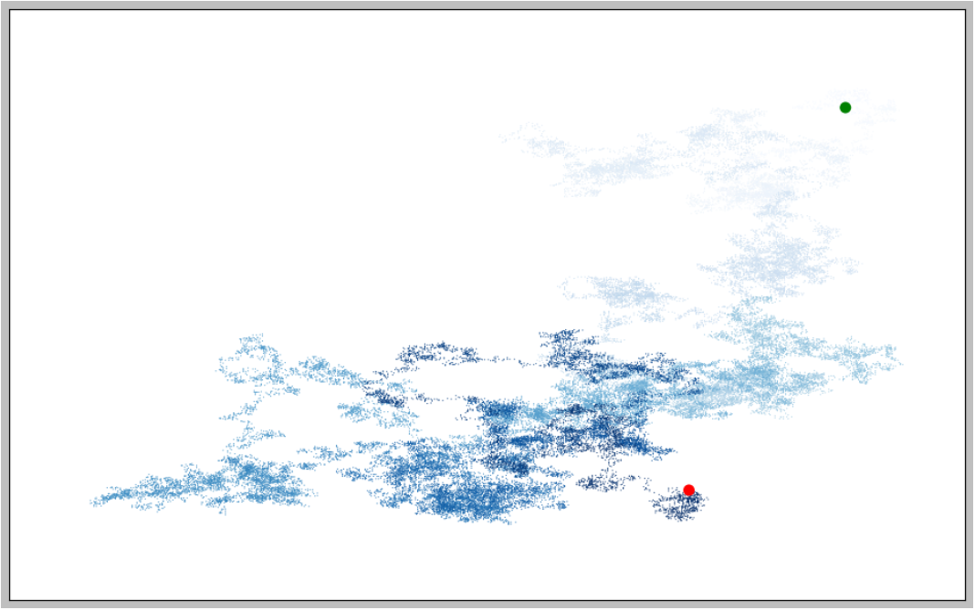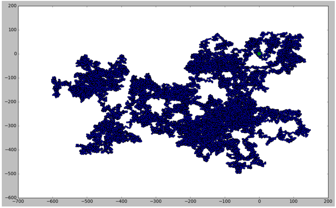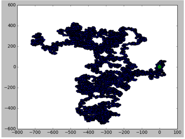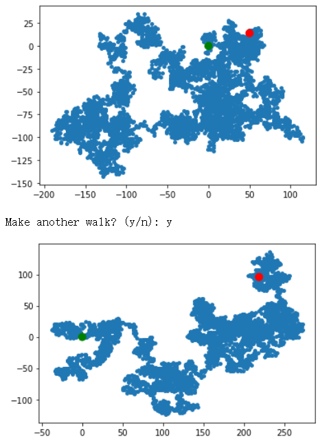 import matplotlib.pyplot as plt # from random_walk import RandomWalk # Keep making new walks, as long as the program is active. while True: # Make a random walk. rw = RandomWalk(50000) rw.fill_walk() # Plot the points in the walk. plt.style.use('classic') fig, ax = plt.subplots(figsize=(15, 9)) point_numbers = range(rw.num_points) ax.scatter(rw.x_values, rw.y_values, c=point_numbers, cmap=plt.cm.Blues, edgecolors='none', s=1) # Emphasize the first and last points. ax.scatter(0, 0, c='green', edgecolors='none', s=100) ax.scatter(rw.x_values[-1], rw.y_values[-1], c='red', edgecolors='none', s=100) # Remove the axes. ax.get_xaxis().set_visible(False) ax.get_yaxis().set_visible(False) plt.show() keep_running = input("Make another walk? (y/n): ") if keep_running == 'n': break