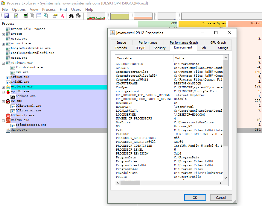 Process Explorer,查询进程的详细信息,如查询java进程启动参数,运行环境,线程信息、网络连接信息、使用了哪些dll,打开了什么句柄。包含注册表、Socket、文件等等。