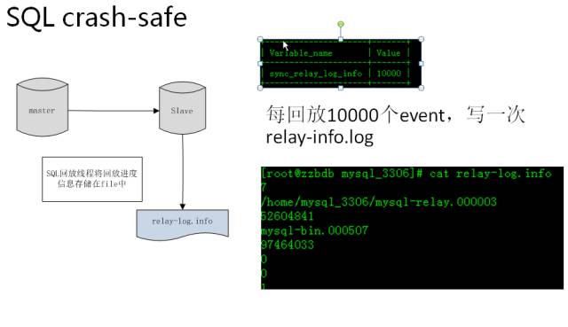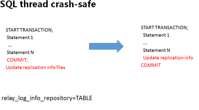 在MySQL 5.6中,提供了SQL/IO thread crash-safe特性。通过将relay_log_info_repository=TABLE,relay-info将信息写入到mysql.slave_relay_log_info这张表中,不但可以保证一致性(写文件变成同一事物的原子操作),还提高了写入性能。