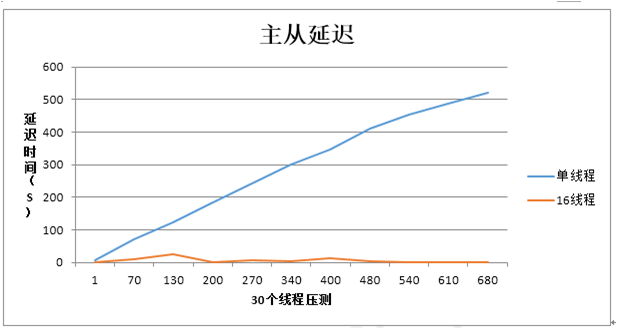 在下图的测试中,MySQL 5.7的多线程复制极大的提升了延迟效率,在30个线程并发操作的时候还能保证平均延迟5.9秒左右,而单线程复制的延迟率基本一直在上升。
