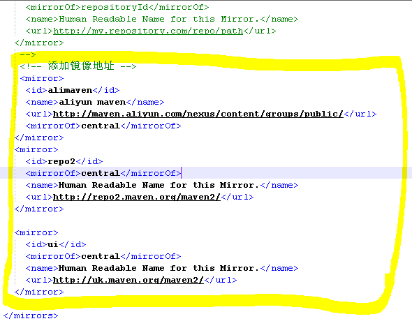1 <!-- 添加镜像地址 --> 2 <mirror> 3 <id>alimaven</id> 4 <name>aliyun maven</name> 5 <url>http://maven.aliyun.com/nexus/content/groups/public/</url> 6 <mirrorOf>central</mirrorOf> 7 </mirror> 8 <mirror> 9 <id>repo2</id> 10 <mirrorOf>central</mirrorOf> 11 <name>Human Readable Name for this Mirror.</name> 12 <url>http://repo2.maven.org/maven2/</url> 13 </mirror> 14 15 <mirror> 16 <id>ui</id> 17 <mirrorOf>central</mirrorOf> 18 <name>Human Readable Name for this Mirror.</name> 19 <url>http://uk.maven.org/maven2/</url> 20 </mirror> 21