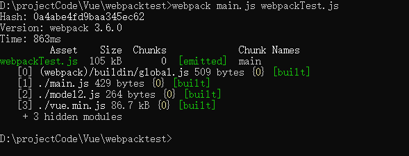 这段指令表示将main.js打包输出为 webpackTest.js文件然后html文件引用webpackTest.js 即可