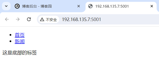 <!DOCTYPE html> <html lang="en"> <head> <meta charset="UTF-8"> <!-- 这里通过挖坑(block)的方式自定义标题,给子模板使用--> <title>{% block title %}{% endblock %}</title> </head> <body> <!--同理这里是也是挖坑(block).--> <!--加入导航条--> <ul> <li><a href="#">首页</a></li> <li><a href="#">新闻</a></li> </ul> {% block body %} {% endblock %} <footer>这是底部的标签</footer> </body> </html>