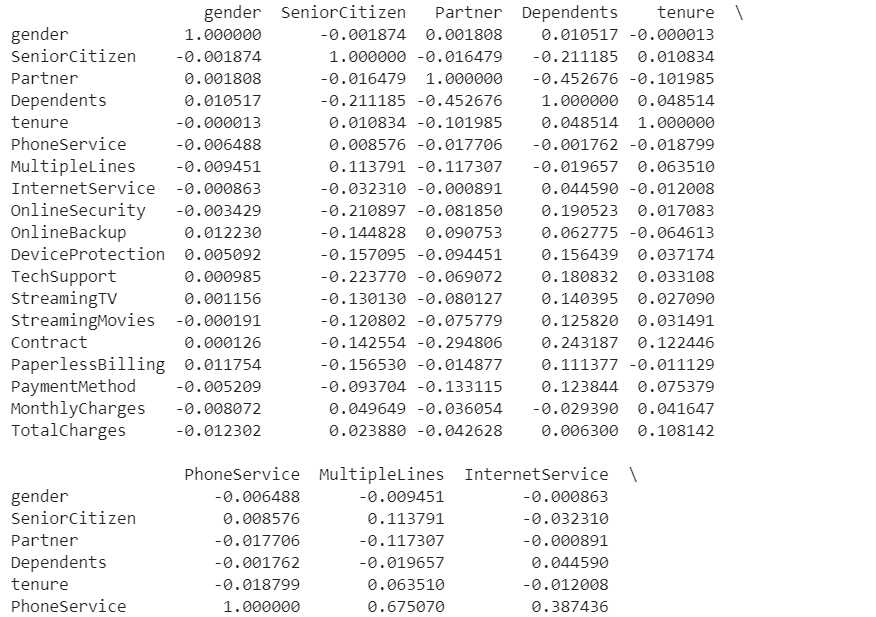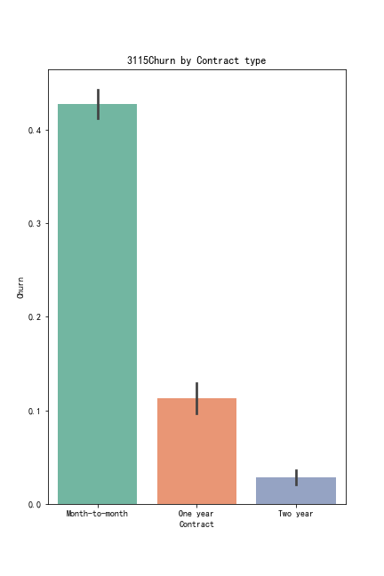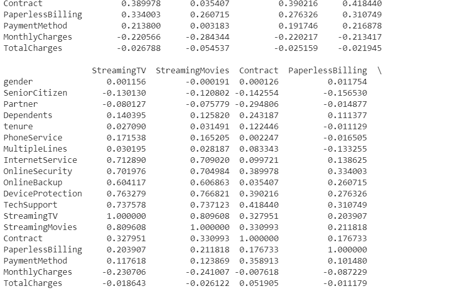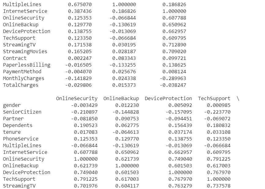 互联网服务、网络安全服务、在线备份业务、设备保护业务、技术支持服务、网络电视和网络电影之间存在较强的相关性,多线业务和电话服务之间也有很强的相关性,并且都呈强正相关关系。在网络安全服务、在线备份业务、设备保护业务、技术支持服务、网络电视和网络电影六个变量中,没有互联网服务的客户流失率值是相同的,都是相对较低。这可能是因为以上六个因素只有在客户使用互联网服务时才会影响客户的决策,这六个因素不会对不使用互联网服务的客户决定是否流失产生推论效应。