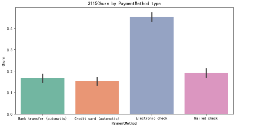 签订合同方式对客户流失率影响为:按月签订 > 按一年签订 > 按两年签订,这可能表明,设定长期合同对留住现有客户更有效。在四种支付方式中,使用Electronic check的用户流流失率最高,其他三种支付方式基本持平,因此可以推断电子账单在设计上影响用户体验。