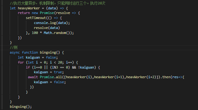 //执行大量异步,机制限制,只能同时运行三个。执行20次 let heavyWorker = (data) => { return new Promise(resolve => { setTimeout(() => { console.log(data); resolve(data) }, 100 * Math.random()); }) } //测 async function bingxing() { let kaiguan = false; for (let i = 0; i < 20; i++) { if (i==0 || (i%3 == 0) && !kaiguan) { kaiguan = true; await Promise.all([heavWorker(i),heavWorker(i+1),heavWorker(i+2)]).then(res=>{ kaiguan = false; }) } } } bingxing();
