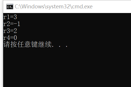 #include<stdio.h> int main(){ int x,y; int r1,r2,r3,r4; x=1; y=2; r1=x+y; r2=x-y; r3=x*y; r4=x/y; printf("r1=%d\n",r1); printf("r2=%d\n",r2); printf("r3=%d\n",r3); printf("r4=%d\n",r4); return 0; }