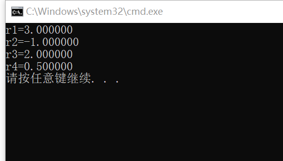 #include<stdio.h> int main(){ float x,y; float r1,r2,r3,r4; x=1; y=2; r1=x+y; r2=x-y; r3=x*y; r4=x/y; printf("r1=%f\n",r1); printf("r2=%f\n",r2); printf("r3=%f\n",r3); printf("r4=%f\n",r4); return 0; }