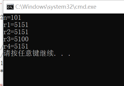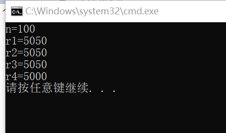 #include<stdio.h> int main(){ int n,r1,r2,r3,r4; n=101; r1=n*(n+1)/2; r2=(n+1)*n/2; r3=n/2*(n+1); r4=(n+1)/2*n; printf("n=%d\n",n); printf("r1=%d\n",r1); printf("r2=%d\n",r2); printf("r3=%d\n",r3); printf("r4=%d\n",r4); return 0; }
