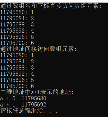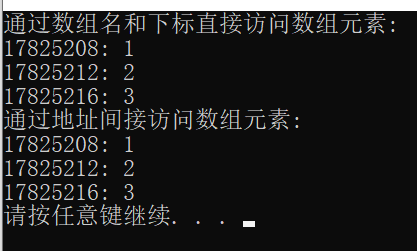 #include <stdio.h> const int N=3; int main() { int a[N] = {1, 2, 3}; int i; printf("通过数组名和下标直接访问数组元素:\n"); for(i=0; i<N; i++) printf("%d: %d\n", &a[i], a[i]); printf("通过地址间接访问数组元素:\n"); for(i=0; i<N; i++) printf("%d: %d\n", a+i, *(a+i)); return 0; }