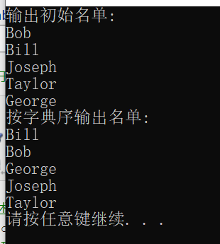 // 练习:使用选择法对字符串按字典序排序 #include <stdio.h> #include<string.h> const int N = 5; void selectSort(char str[][20], int n ); // 函数声明,形参str是二维数组名 int main() { char name[][20] = {"Bob", "Bill", "Joseph", "Taylor", "George"}; int i; printf("输出初始名单:\n"); for(i=0; i<N; i++) printf("%s\n", name[i]); selectSort(name, N); // 调用选择法对name数组中的字符串排序 printf("按字典序输出名单:\n"); for(i=0; i<N; i++) printf("%s\n", name[i]); return 0; } // 函数定义 // 函数功能描述:使用选择法对二维数组str中的n个字符串按字典序排序 void selectSort(char str[][20], int n) { // 补足代码 // ××× int i, j, k; char temp[20]; for(i=0; i<n-1; i++) { k = i; // k用于记录当前最小元素的下标 for(j=i+1; j<n; j++) if (strcmp(str[j] , str[k])<0) k = j; // 如果a[j]比当前最小元素还要小,就更新k,确保它总是存放最小元素的下标 if(k != i) { // 找到最小元素后,交换a[i]和a[k] strcpy(temp , str[i]); strcpy(str[i] ,str[k]); strcpy(str[k] , temp); } } }