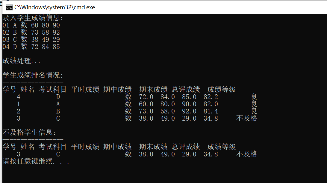 // P280例8.15 // 对教材上的程序作了微调整,把输出学生信息单独编写成一个函数模块 // 打印不及格学生信息和所有学生信息程分别调用 #include<stdio.h> #include<stdlib.h> #include<string.h> #define N 4 // 运行程序输入测试时,可以把N改小一些输入测试 typedef struct student { int id; /*学生学号 */ char name[20]; /*学生姓名 */ char subject[20]; /*考试科目 */ float perf; /*平时成绩 */ float mid; /* 期中成绩 */ float final; /* 期末成绩 */ float total; /* 总评成绩 */ char level[10]; /* 成绩等级 */ } STU; void input(STU[],int ); /*输入学生信息 */ void calc(STU[],int); /*计算总评和等级 */ int fail(STU[],STU [],int); /*不及格学生统计 */ void sort(STU[],int); /*排序 */ void print(STU[], int); /*输出学生信息*/ int main() { STU st[N],fst[N]; // 数组st记录学生信息,fst记录不及格学生信息 int k; // 用于记录不及格学生个数 printf("录入学生成绩信息:\n"); input(st,N); printf("\n成绩处理...\n"); calc(st,N); k = fail(st,fst,N); sort(st, N); printf("\n学生成绩排名情况:\n"); print(st, N); printf("\n不及格学生信息:\n"); print(fst, k); return 0; } // 输入学生信息 void input(STU s[],int n) { int i; for(i=0;i<n;i++) scanf("%d %s %s %f %f %f",&s[i].id,s[i].name,s[i].subject,&s[i].perf,&s[i].mid,&s[i].final); } // 计算总评和等级 void calc(STU s[],int n) { int i; for(i=0;i<n;i++) { s[i].total=s[i].perf*0.2+s[i].mid*0.2+s[i].final*0.6; if(s[i].total>=90) strcpy(s[i].level,"优"); // 注意:等级是字符型数组,要使用strcpy完成赋值 else if(s[i].total>=80 && s[i].total<90) strcpy(s[i].level,"良"); else if(s[i].total>=70 && s[i].total<80) strcpy(s[i].level,"中"); else if(s[i].total>=60 && s[i].total<70) strcpy(s[i].level,"及格"); else strcpy(s[i].level,"不及格"); } } // 不及格学生统计 // 数组s存放的是所有学生信息,数组t存放不及格学生信息,n是数组s中元素个数 // 函数返回值:返回的是不及格人数 int fail(STU s[],STU t[],int n) { int i,k=0; for(i=0;i<n;i++) if(s[i].total<60) t[k++]=s[i]; return k; } // 根据总评成绩对学生记录信息排序 // 使用的是冒泡排序算法 void sort(STU s[],int n) { int i,j; STU temp; for(i=0;i<n-1;i++) for(j=0;j<n-1-i;j++) if(s[j].total<s[j+1].total) { temp = s[j]; s[j] = s[j+1]; s[j+1] = temp; } } // 输出学生信息 void print(STU s[], int n) { int i; printf("-----------------\n"); printf("学号 姓名 考试科目 平时成绩 期中成绩 期末成绩 总评成绩 成绩等级\n"); for(i=0;i<n;i++) printf("%5d %10s%20s %5.1f %5.1f %5.1f %5.1f %10s\n",s[i].id,s[i].name,s[i].subject,s[i].perf,s[i].mid,s[i].final,s[i].total,s[i].level); }