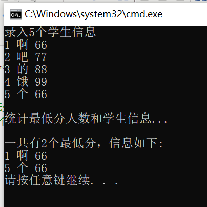 #include <stdio.h> const int N=5; // 定义结构体类型struct student,并定义STU为其别名 typedef struct student { long no; char name[20]; int score; }STU; // 函数声明 void input(STU s[], int n); int findMinlist(STU s[], STU t[], int n); void output(STU s[], int n); int main() { STU stu[N], minlist[N]; int count; printf("录入%d个学生信息\n", N); input(stu, N); printf("\n统计最低分人数和学生信息...\n"); count = findMinlist(stu, minlist, N); printf("\n一共有%d个最低分,信息如下:\n", count); output(minlist, count); return 0; } // 输入n个学生信息,存放在结构体数组s中 void input(STU s[], int n) { int i; for(i=0; i<n; i++) scanf("%ld %s %d", &s[i].no, s[i].name, &s[i].score); } // 输出结构体s中n个元素信息 void output(STU s[], int n) { int i; for(i=0; i<n; i++) printf("%ld %s %d\n", s[i].no, s[i].name, s[i].score); } // 在结构体数组s中,查找最低分学生的记录,将其存入结构体数组t中 // 形参n是结构体数组s中元素个数 // 函数返回最低分的学生人数 int findMinlist(STU s[], STU t[], int n) { // 补足函数实现 n=0; int i,min; min=s[0].score; for(i=0;i<N;i++){ if(s[i].score<min) min=s[i].score; } for(i=0;i<N;i++){ if(s[i].score==min) t[n++]=s[i]; } return n; }