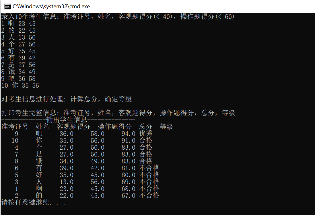 #include <stdio.h> #include <string.h> const int N = 10; // 定义结构体类型struct student,并定义其别名为STU typedef struct student { long int id; char name[20]; float objective; /*客观题得分*/ float subjective; /*操作题得分*/ float sum; char level[10]; }STU; // 函数声明 void input(STU s[], int n); void output(STU s[], int n); void process(STU s[], int n); int main() { STU stu[N]; printf("录入%d个考生信息: 准考证号,姓名,客观题得分(<=40),操作题得分(<=60)\n", N); input(stu, N); printf("\n对考生信息进行处理: 计算总分,确定等级\n"); process(stu, N); printf("\n打印考生完整信息: 准考证号,姓名,客观题得分,操作题得分,总分,等级\n"); output(stu, N); return 0; } // 录入考生信息:准考证号,姓名,客观题得分,操作题得分 void input(STU s[], int n) { // 补足代码 // ××× for (int i = 0; i < n; i++) scanf("%ld %s %f %f",&s[i].id,s[i].name,&s[i].objective,&s[i].subjective); } //输出考生完整信息: 准考证号,姓名,客观题得分,操作题得分,总分,等级 void output(STU s[], int n) { // 补足代码 // ××× printf("-------------输出学生信息--------------\n"); printf("准考证号 姓名 客观题得分 操作题得分 总分 等级\n"); for (int i = 0; i < n; ++i) printf("%5ld %6s %8.1f %8.1f %8.1f %4s\n",s[i].id,s[i].name,s[i].objective,s[i].subjective,s[i].sum,s[i].level); } // 对考生信息进行处理:计算总分,排序,确定等级 void process(STU s[], int n) { // 补足代码 // ××× //计算总分 for (int i = 0; i < n; ++i) s[i].sum=s[i].objective+s[i].subjective; //排序(冒泡排序,降序) STU temp; for (int i = 0; i < n-1; i++) { for (int j = 0; j < n-1-i; j++) { if (s[j].sum<s[j+1].sum){ temp=s[j]; s[j]=s[j+1]; s[j+1]=temp; } } } //根据比例划分等级 for (int i = 0; i < n; i++) { if (i<=(n/10)-1) //数组序列从0开始 strcpy(s[i].level,"优秀"); else if (i<=(n/2)-1) strcpy(s[i].level,"合格"); else strcpy(s[i].level,"不合格"); } }