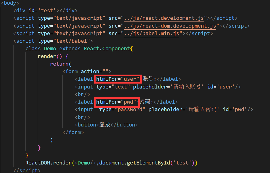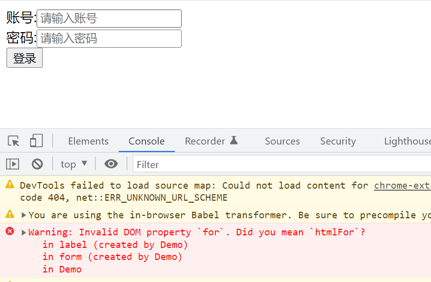 解决办法:react中label标签没有for属性,用htmlFor代替for属性