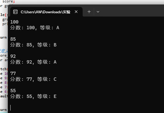 #include <stdio.h> char score_to_grade(int score); // 函数声明 int main() { int score; char grade; while(scanf("%d", &score) != EOF) { grade = score_to_grade(score); // 函数调用 printf("分数: %d, 等级: %c\n\n", score, grade); } return 0; } // 函数定义 char score_to_grade(int score) { char ans; switch(score/10) { case 10: case 9: ans = 'A'; break; case 8: ans = 'B'; break; case 7: ans = 'C'; break; case 6: ans = 'D'; break; default: ans = 'E'; } return ans; }