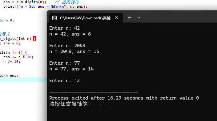 #include <stdio.h> int sum_digits(int n); // 函数声明 int main() { int n; int ans; while(printf("Enter n: "), scanf("%d", &n) != EOF) { ans = sum_digits(n); // 函数调用 printf("n = %d, ans = %d\n\n", n, ans); } return 0; } // 函数定义 int sum_digits(int n) { int ans = 0; while(n != 0) { ans += n % 10; n /= 10; } return ans; }