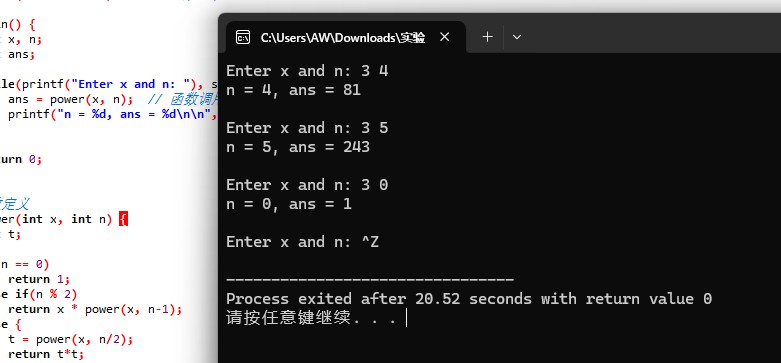 #include <stdio.h> int power(int x, int n); // 函数声明 int main() { int x, n; int ans; while(printf("Enter x and n: "), scanf("%d%d", &x, &n) != EOF) { ans = power(x, n); // 函数调用 printf("n = %d, ans = %d\n\n", n, ans); } return 0; } // 函数定义 int power(int x, int n) { int t; if(n == 0) return 1; else if(n % 2) return x * power(x, n-1); else { t = power(x, n/2); return t*t; } }