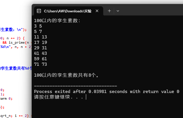 #include <stdio.h> #include <math.h> int is_prime(int n); int main() { int count = 0; printf("100以内的孪生素数:\n"); int n; for ( n = 3; n <= 98; n += 2) { if (is_prime(n) && is_prime(n + 2)) { printf("%d %d\n", n, n + 2); count++; } } printf("\n100以内的孪生素数共有%d个。\n", count); return 0; } int is_prime(int n) { if (n <= 1) return 0; if (n == 2) return 1; if (n % 2 == 0) return 0; int sqrt_n = sqrt(n); int i; for ( i = 3; i <= sqrt_n; i += 2) { if (n % i == 0) return 0; } return 1; }