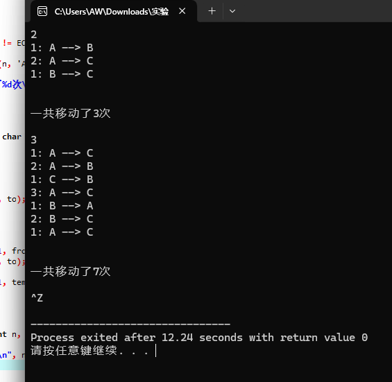 #include <stdio.h> int hanoi(unsigned int n, char from, char temp, char to); void moveplate(unsigned int n, char from, char to); int main() { unsigned int n; while(scanf("%u", &n) != EOF) { int count = hanoi(n, 'A', 'B', 'C'); printf("\n\n"); printf("一共移动了%d次\n\n", count); } return 0; } int hanoi(unsigned int n, char from, char temp, char to) { int count = 0; if(n == 1) { moveplate(n, from, to); count++; } else { count += hanoi(n-1, from, to, temp); moveplate(n, from, to); count++; count += hanoi(n-1, temp, from, to); } return count; } void moveplate(unsigned int n, char from, char to) { printf("%u: %c --> %c\n", n, from, to); }