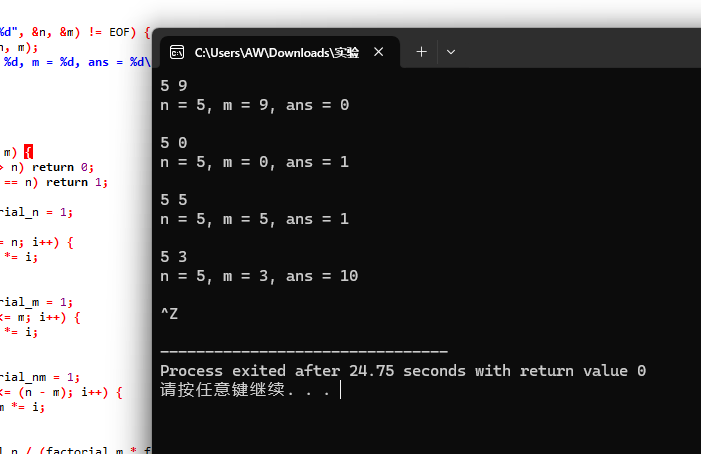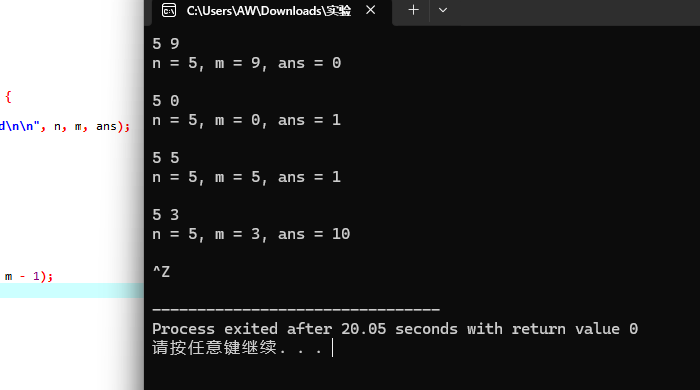 #include <stdio.h> int func(int n, int m); int main() { int n, m; int ans; while(scanf("%d%d", &n, &m) != EOF) { ans = func(n, m); printf("n = %d, m = %d, ans = %d\n\n", n, m, ans); } return 0; } int func(int n, int m) { if (m < 0 || m > n) return 0; if (m == 0 || m == n) return 1; long long factorial_n = 1; int i; for (i = 1; i <= n; i++) { factorial_n *= i; } long long factorial_m = 1; for ( i = 1; i <= m; i++) { factorial_m *= i; } long long factorial_nm = 1; for ( i = 1; i <= (n - m); i++) { factorial_nm *= i; } return factorial_n / (factorial_m * factorial_nm); }