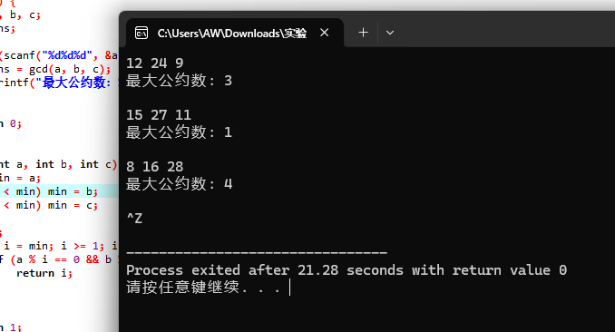 #include <stdio.h> int gcd(int a, int b, int c); int main() { int a, b, c; int ans; while(scanf("%d%d%d", &a, &b, &c) != EOF) { ans = gcd(a, b, c); printf("最大公约数: %d\n\n", ans); } return 0; } int gcd(int a, int b, int c) { int min = a; if (b < min) min = b; if (c < min) min = c; int i; for ( i = min; i >= 1; i--) { if (a % i == 0 && b % i == 0 && c % i == 0) { return i; } } return 1; }