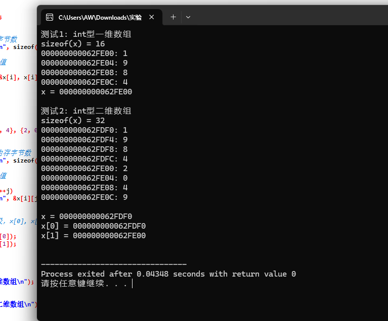 #include <stdio.h> #define N 4 #define M 2 void test1() { int x[N] = {1, 9, 8, 4}; int i; // 输出数组x占用的内存字节数 printf("sizeof(x) = %d\n", sizeof(x)); // 输出每个元素的地址、值 for (i = 0; i < N; ++i) printf("%p: %d\n", &x[i], x[i]); // 输出数组名x对应的值 printf("x = %p\n", x); } void test2() { int x[M][N] = {{1, 9, 8, 4}, {2, 0, 4, 9}}; int i, j; // 输出二维数组x占用的内存字节数 printf("sizeof(x) = %d\n", sizeof(x)); // 输出每个元素的地址、值 for (i = 0; i < M; ++i) for (j = 0; j < N; ++j) printf("%p: %d\n", &x[i][j], x[i][j]); printf("\n"); // 输出二维数组名x, 以及,x[0], x[1]的值 printf("x = %p\n", x); printf("x[0] = %p\n", x[0]); printf("x[1] = %p\n", x[1]); printf("\n"); } int main() { printf("测试1: int型一维数组\n"); test1(); printf("\n测试2: int型二维数组\n"); test2(); return 0; }
