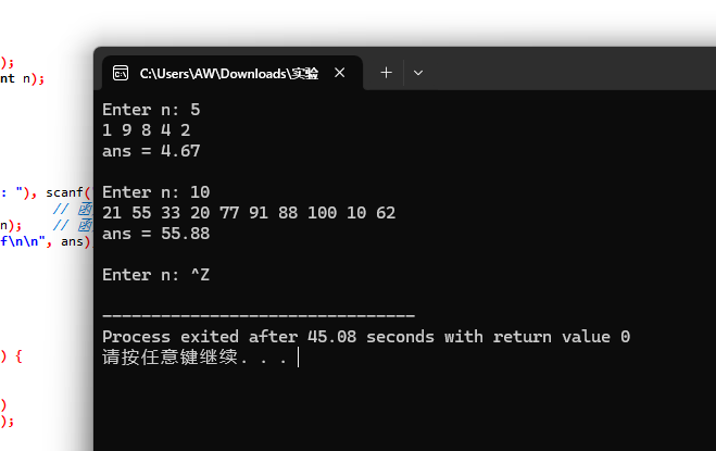 #include <stdio.h> #define N 100 // 函数声明 void input(int x[], int n); double compute(int x[], int n); int main() { int x[N]; int n, i; double ans; while(printf("Enter n: "), scanf("%d", &n) != EOF) { input(x, n); // 函数调用 ans = compute(x, n); // 函数调用 printf("ans = %.2f\n\n", ans); } return 0; } // 函数定义 void input(int x[], int n) { int i; for(i = 0; i < n; ++i) scanf("%d", &x[i]); } // 函数定义 double compute(int x[], int n) { int i, high, low; double ans; high = low = x[0]; ans = 0; for(i = 0; i < n; ++i) { ans += x[i]; if(x[i] > high) high = x[i]; else if(x[i] < low) low = x[i]; } ans = (ans - high - low)/(n-2); return ans; }