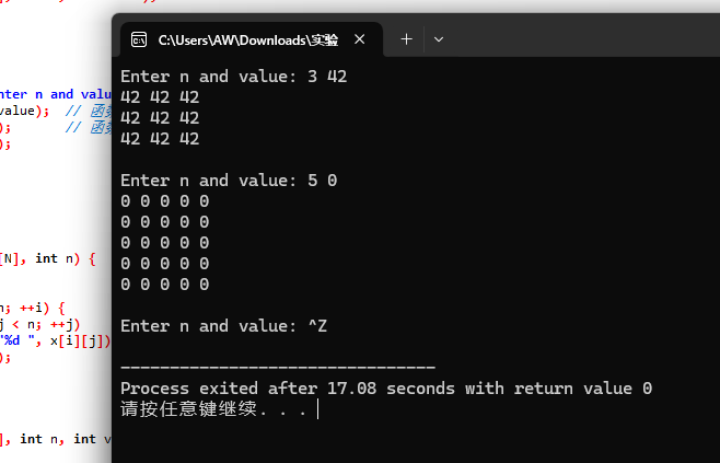 #include <stdio.h> #define N 100 // 函数声明 void output(int x[][N], int n); void init(int x[][N], int n, int value); int main() { int x[N][N]; int n, value; while(printf("Enter n and value: "), scanf("%d%d", &n, &value) != EOF) { init(x, n, value); // 函数调用 output(x, n); // 函数调用 printf("\n"); } return 0; } // 函数定义 void output(int x[][N], int n) { int i, j; for(i = 0; i < n; ++i) { for(j = 0; j < n; ++j) printf("%d ", x[i][j]); printf("\n"); } } // 函数定义 void init(int x[][N], int n, int value) { int i, j; for(i = 0; i < n; ++i) for(j = 0; j < n; ++j) x[i][j] = value; }