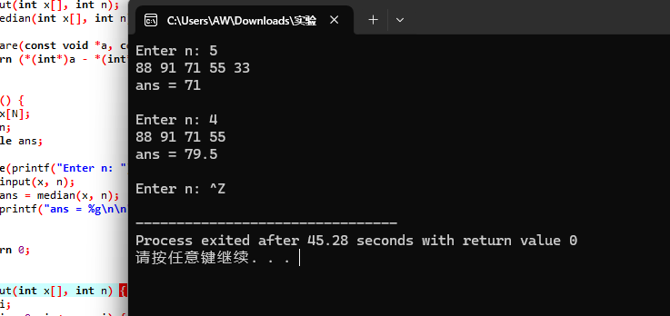 #include <stdio.h> #include <stdlib.h> #define N 100 void input(int x[], int n); double median(int x[], int n); int compare(const void *a, const void *b) { return (*(int*)a - *(int*)b); } int main() { int x[N]; int n; double ans; while(printf("Enter n: "), scanf("%d", &n) != EOF) { input(x, n); ans = median(x, n); printf("ans = %g\n\n", ans); } return 0; } void input(int x[], int n) { int i; for(i = 0; i < n; ++i) { scanf("%d", &x[i]); } } double median(int x[], int n) { qsort(x, n, sizeof(int), compare); if(n % 2 == 1) { return x[n/2]; } else { return (x[n/2 - 1] + x[n/2]) / 2.0; } }
