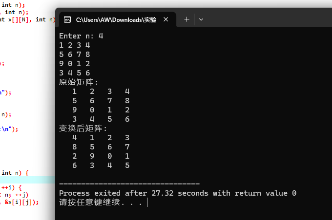 #include <stdio.h> #define N 100 void input(int x[][N], int n); void output(int x[][N], int n); void rotate_to_right(int x[][N], int n); int main() { int x[N][N]; int n; printf("Enter n: "); scanf("%d", &n); input(x, n); printf("原始矩阵:\n"); output(x, n); rotate_to_right(x, n); printf("变换后矩阵:\n"); output(x, n); return 0; } void input(int x[][N], int n) { int i, j; for (i = 0; i < n; ++i) { for (j = 0; j < n; ++j) scanf("%d", &x[i][j]); } } void output(int x[][N], int n) { int i, j; for (i = 0; i < n; ++i) { for (j = 0; j < n; ++j) printf("%4d", x[i][j]); printf("\n"); } } void rotate_to_right(int x[][N], int n) { int i, j; int temp[N]; for (i = 0; i < n; ++i) { temp[i] = x[i][n-1]; } for (j = n-1; j > 0; --j) { for (i = 0; i < n; ++i) { x[i][j] = x[i][j-1]; } } for (i = 0; i < n; ++i) { x[i][0] = temp[i]; } }