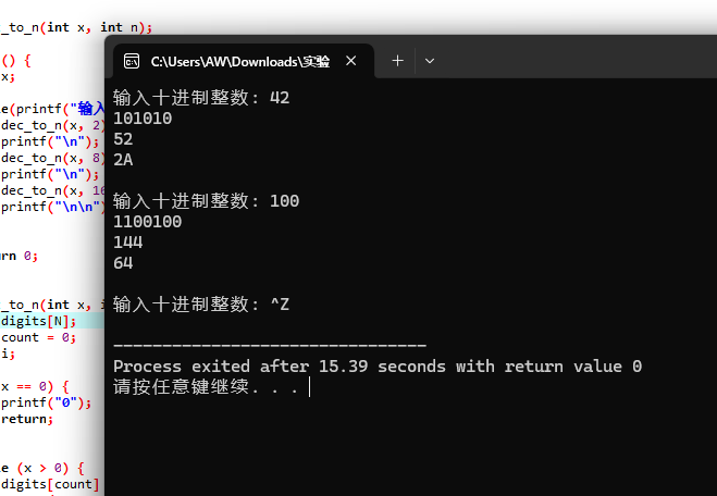 #include <stdio.h> #define N 100 void dec_to_n(int x, int n); int main() { int x; while(printf("输入十进制整数: "), scanf("%d", &x) != EOF) { dec_to_n(x, 2); printf("\n"); dec_to_n(x, 8); printf("\n"); dec_to_n(x, 16); printf("\n\n"); } return 0; } void dec_to_n(int x, int n) { int digits[N]; int count = 0; int i; if (x == 0) { printf("0"); return; } while (x > 0) { digits[count] = x % n; x = x / n; count++; } for (i = count - 1; i >= 0; i--) { if (digits[i] < 10) { printf("%d", digits[i]); } else { printf("%c", 'A' + (digits[i] - 10)); } } }