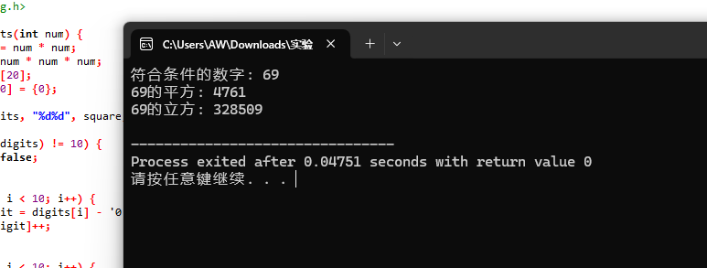 #include <stdio.h> #include <stdbool.h> #include <string.h> bool check_digits(int num) { int square = num * num; int cube = num * num * num; char digits[20]; int count[10] = {0}; sprintf(digits, "%d%d", square, cube); if (strlen(digits) != 10) { return false; } int i; for (i = 0; i < 10; i++) { int digit = digits[i] - '0'; count[digit]++; } for (i = 0; i < 10; i++) { if (count[i] != 1) { return false; } } return true; } int main() { int num; for (num = 1; num < 100000; num++) { if (check_digits(num)) { printf("符合条件的数字: %d\n", num); printf("%d的平方: %d\n", num, num * num); printf("%d的立方: %d\n", num, num * num * num); return 0; } } return 0; }