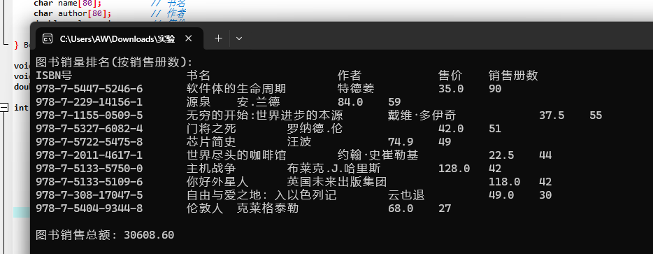 #include <stdio.h> #define N 10 typedef struct { char isbn[20]; // isbn号 char name[80]; // 书名 char author[80]; // 作者 double sales_price; // 售价 int sales_count; // 销售册数 } Book; void output(Book x[], int n); void sort(Book x[], int n); double sales_amount(Book x[], int n); int main() { Book x[N] = {{"978-7-5327-6082-4", "门将之死", "罗纳德.伦", 42, 51}, {"978-7-308-17047-5", "自由与爱之地:入以色列记", "云也退", 49 , 30}, {"978-7-5404-9344-8", "伦敦人", "克莱格泰勒", 68, 27}, {"978-7-5447-5246-6", "软件体的生命周期", "特德姜", 35, 90}, {"978-7-5722-5475-8", "芯片简史", "汪波", 74.9, 49}, {"978-7-5133-5750-0", "主机战争", "布莱克.J.哈里斯", 128, 42}, {"978-7-2011-4617-1", "世界尽头的咖啡馆", "约翰·史崔勒基", 22.5, 44}, {"978-7-5133-5109-6", "你好外星人", "英国未来出版集团", 118, 42}, {"978-7-1155-0509-5", "无穷的开始:世界进步的本源", "戴维·多伊奇", 37.5, 55}, {"978-7-229-14156-1", "源泉", "安.兰德", 84, 59}}; printf("图书销量排名(按销售册数): \n"); sort(x, N); output(x, N); printf("\n图书销售总额: %.2f\n", sales_amount(x, N)); return 0; } void output(Book x[], int n) { printf("ISBN号\t\t\t书名\t\t\t作者\t\t售价\t销售册数\n"); int i; for (i = 0; i < n; i++) { printf("%s\t%s\t%s\t\t%.1f\t%d\n", x[i].isbn, x[i].name, x[i].author, x[i].sales_price, x[i].sales_count); } } void sort(Book x[], int n) { int i,j; for (i = 0; i < n - 1; i++) { for (j = 0; j < n - i - 1; j++) { if (x[j].sales_count < x[j + 1].sales_count) { Book temp = x[j]; x[j] = x[j + 1]; x[j + 1] = temp; } } } } double sales_amount(Book x[], int n) { double total = 0.0; int i; for (i = 0; i < n; i++) { total += x[i].sales_price * x[i].sales_count; } return total; }