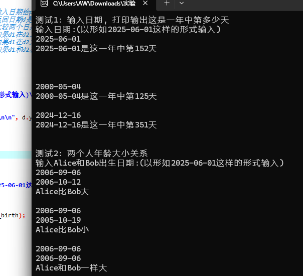 #include <stdio.h> typedef struct { int year; int month; int day; } Date; // 函数声明 void input(Date *pd); // 输入日期给pd指向的Date变量 int day_of_year(Date d); // 返回日期d是这一年的第多少天 int compare_dates(Date d1, Date d2); // 比较两个日期: // 如果d1在d2之前,返回-1; // 如果d1在d2之后,返回1 // 如果d1和d2相同,返回0 void test1() { Date d; int i; printf("输入日期:(以形如2025-06-01这样的形式输入)\n"); for(i = 0; i < 3; ++i) { input(&d); printf("%d-%02d-%02d是这一年中第%d天\n\n", d.year, d.month, d.day, day_of_year(d)); } } void test2() { Date Alice_birth, Bob_birth; int i; int ans; printf("输入Alice和Bob出生日期:(以形如2025-06-01这样的形式输入)\n"); for(i = 0; i < 3; ++i) { input(&Alice_birth); input(&Bob_birth); ans = compare_dates(Alice_birth, Bob_birth); if(ans == 0) printf("Alice和Bob一样大\n\n"); else if(ans == -1) printf("Alice比Bob大\n\n"); else printf("Alice比Bob小\n\n"); } } int main() { printf("测试1: 输入日期, 打印输出这是一年中第多少天\n"); test1(); printf("\n测试2: 两个人年龄大小关系\n"); test2(); return 0; } // 补足函数input实现 // 功能: 输入日期给pd指向的Date变量 void input(Date *pd) { scanf("%d-%d-%d", &pd->year, &pd->month, &pd->day); } // 补足函数day_of_year实现 // 功能:返回日期d是这一年的第多少天 int day_of_year(Date d) { int days_in_month[] = {31, 28, 31, 30, 31, 30, 31, 31, 30, 31, 30, 31}; int day_count = d.day; // 检查是否为闰年 if ((d.year % 4 == 0 && d.year % 100 != 0) || (d.year % 400 == 0)) { days_in_month[1] = 29; // 闰年2月有29天 } int i; for (i = 0; i < d.month - 1; i++) { day_count += days_in_month[i]; } return day_count; } // 补足函数compare_dates实现 // 功能:比较两个日期: // 如果d1在d2之前,返回-1; // 如果d1在d2之后,返回1 // 如果d1和d2相同,返回0 int compare_dates(Date d1, Date d2) { if (d1.year < d2.year) { return -1; } else if (d1.year > d2.year) { return 1; } else { if (d1.month < d2.month) { return -1; } else if (d1.month > d2.month) { return 1; } else { if (d1.day < d2.day) { return -1; } else if (d1.day > d2.day) { return 1; } else { return 0; } } } }