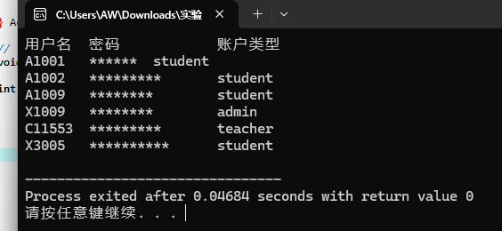 #include <stdio.h> #include <string.h> enum Role {admin, student, teacher}; typedef struct { char username[20]; // 用户名 char password[20]; // 密码 enum Role type; // 账户类型 } Account; // 函数声明 void output(Account x[], int n); // 输出账户数组x中n个账户信息,其中,密码用*替代显示 int main() { Account x[] = {{"A1001", "123456", student}, {"A1002", "123abcdef", student}, {"A1009", "xyz12121", student}, {"X1009", "9213071x", admin}, {"C11553", "129dfg32k", teacher}, {"X3005", "921kfmg917", student}}; int n; n = sizeof(x)/sizeof(Account); output(x, n); return 0; } // 补足函数output实现 // 功能:遍历输出账户数组x中n个账户信息 // 显示时,密码字段以与原密码相同字段长度的*替代显示 void output(Account x[], int n) { printf("用户名\t密码\t\t账户类型\n"); int i,j; for (i = 0; i < n; i++) { // 密码用*替代显示 int len = strlen(x[i].password); char stars[20]; for (j = 0; j < len; j++) { stars[j] = '*'; } stars[len] = '\0'; // 字符串结尾 // 账户类型转换为字符串 char role_str[10]; switch (x[i].type) { case admin: strcpy(role_str, "admin"); break; case student: strcpy(role_str, "student"); break; case teacher: strcpy(role_str, "teacher"); break; default: strcpy(role_str, "unknown"); break; } printf("%s\t%s\t%s\n", x[i].username, stars, role_str); } }