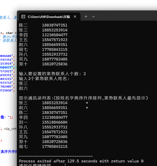 #include <stdio.h> #include <string.h> typedef struct { char name[20]; // 姓名 char phone[12]; // 手机号 int vip; // 是否为紧急联系人,是取1;否则取0 } Contact; // 函数声明 void set_vip_contact(Contact x[], int n, char name[]); // 设置紧急联系人 void output(Contact x[], int n); // 输出x中联系人信息 void display(Contact x[], int n); // 按联系人姓名字典序升序显示信息,紧急联系人最先显示 #define N 10 int main() { Contact list[N] = {{"刘一", "15510846604", 0}, {"陈二", "18038747351", 0}, {"张三", "18853253914", 0}, {"李四", "13230584477", 0}, {"王五", "15547571923", 0}, {"赵六", "18856659351", 0}, {"周七", "17705843215", 0}, {"孙八", "15552933732", 0}, {"吴九", "18077702405", 0}, {"郑十", "18820725036", 0}}; int vip_cnt, i; char name[20]; printf("显示原始通讯录信息: \n"); output(list, N); printf("\n输入要设置的紧急联系人个数: "); scanf("%d", &vip_cnt); printf("输入%d个紧急联系人姓名:\n", vip_cnt); for(i = 0; i < vip_cnt; ++i) { scanf("%s", name); set_vip_contact(list, N, name); } printf("\n显示通讯录列表:(按姓名字典序升序排列,紧急联系人最先显示)\n"); display(list, N); return 0; } // 补足函数set_vip_contact实现 // 功能:将联系人数组x中,联系人姓名与name一样的人,设置为紧急联系人(即成员vip值设为1) void set_vip_contact(Contact x[], int n, char name[]) { int i; for (i = 0; i < n; i++) { if (strcmp(x[i].name, name) == 0) { x[i].vip = 1; break; } } } // 补足函数display实现 // 功能: 显示联系人数组x中的联系人信息 void display(Contact x[], int n) { int i,j; for (i = 0; i < n - 1; i++) { for (j = 0; j < n - i - 1; j++) { if (x[j].vip == x[j + 1].vip) { if (strcmp(x[j].name, x[j + 1].name) > 0) { Contact temp = x[j]; x[j] = x[j + 1]; x[j + 1] = temp; } } else if (x[j].vip < x[j + 1].vip) { Contact temp = x[j]; x[j] = x[j + 1]; x[j + 1] = temp; } } } for (i = 0; i < n; i++) { printf("%-10s%-15s", x[i].name, x[i].phone); if (x[i].vip) { printf("%5s", "*"); } printf("\n"); } } void output(Contact x[], int n) { int i; for(i = 0; i < n; ++i) { printf("%-10s%-15s", x[i].name, x[i].phone); if(x[i].vip) printf("%5s", "*"); printf("\n"); } }